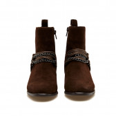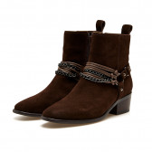 Questo elegante stivaletto in camoscio marrone è un mix di classe e audacia. Sul lato, presenta una combinazione di catene e cinturini che avvolgono la caviglia. Il design affusolato della punta e il tacco squadrato in legno aggiungono un tocco di femminilità, rendendolo un pezzo versatile.