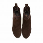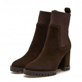 Questo stivaletto alla caviglia in camoscio marrone scuro unisce comfort e stile. La tomaia combina il morbido camoscio con un inserto a coste in tessuto elasticizzato, che avvolge la caviglia come un calzino. La suola carrarmato e il tacco largo offrono stabilità e un tocco urbano.
