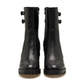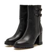 Stivaletto in pelle nera con un design che mixa eleganza e carattere. Le due fibbie dorate sulla caviglia aggiungono un tocco audace, mentre la suola a carrarmato e il tacco largo offrono stabilità e un'estetica robusta. Perfetto per un look autunnale chic e grintoso.