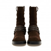 Questo robusto anfibio in camoscio marrone scuro ha un design deciso e grintoso. La tomaia liscia è arricchita da cinturini e da una doppia catena in metallo brunito che avvolge la caviglia. La suola platform e il tacco largo e robusto aggiungono un tocco di forza e stabilità.