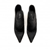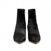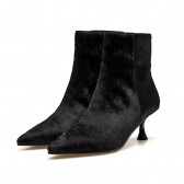 Questo raffinato stivaletto alla caviglia è realizzato in pelle cavallino nera, con una texture dal pelo corto che lo rende unico. La silhouette slanciata, la punta affusolata e il sottile tacco a rocchetto creano un look elegante e sofisticato, perfetto per completare un outfit serale.