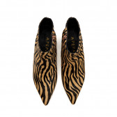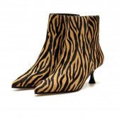 Questo raffinato stivaletto alla caviglia è realizzato in pelle stampata animalier, con una texture dal pelo corto che lo rende unico. La silhouette slanciata, la punta affusolata e il sottile tacco a rocchetto creano un look grintoso e sofisticato, perfetto per completare un outfit serale.