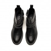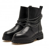 Questo anfibio in pelle nera incarna un look deciso e grintoso. La tomaia liscia è arricchita da una cascata di catene metalliche scure che avvolgono la caviglia, aggiungendo un tocco di grinta. La suola robusta e spessa completa il look, offrendo stabilità e un'estetica rock.