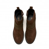 Questo anfibio in scamosciato marrone incarna un look deciso e grintoso. La tomaia liscia è arricchita da una cascata di catene metalliche scure che avvolgono la caviglia, aggiungendo un tocco di grinta. La suola robusta e spessa completa il look, offrendo stabilità e un'estetica rock.