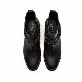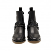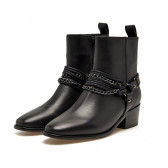 Questo elegante stivaletto in pelle nera è un mix di classe e audacia. Sul lato, presenta una combinazione di catene e cinturini che avvolgono la caviglia. Il design affusolato della punta e il tacco squadrato in legno aggiungono un tocco di femminilità, rendendolo un pezzo versatile.
