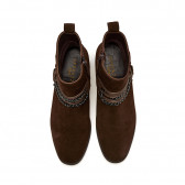 Questo elegante stivaletto in camoscio marrone è un mix di classe e audacia. Sul lato, presenta una combinazione di catene e cinturini che avvolgono la caviglia. Il design affusolato della punta e il tacco squadrato in legno aggiungono un tocco di femminilità, rendendolo un pezzo versatile.