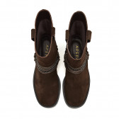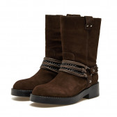 Questo robusto anfibio in camoscio marrone scuro ha un design deciso e grintoso. La tomaia liscia è arricchita da cinturini e da una doppia catena in metallo brunito che avvolge la caviglia. La suola platform e il tacco largo e robusto aggiungono un tocco di forza e stabilità.