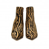 Questo raffinato stivaletto alla caviglia è realizzato in pelle stampata animalier, con una texture dal pelo corto che lo rende unico. La silhouette slanciata, la punta affusolata e il sottile tacco a rocchetto creano un look grintoso e sofisticato, perfetto per completare un outfit serale.