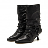 Questo stivaletto in pelle nera incarna un'eleganza raffinata e contemporanea. La tomaia morbida e arricciata crea un look sofisticato, mentre la punta affusolata e il sottile tacco a rocchetto slanciano la figura. Un cinturino laterale con anello metallico aggiunge un tocco di grinta.