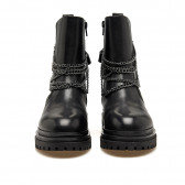 Questo anfibio in pelle nera incarna un look deciso e grintoso. La tomaia liscia è arricchita da una cascata di catene metalliche scure che avvolgono la caviglia, aggiungendo un tocco di grinta. La suola robusta e spessa completa il look, offrendo stabilità e un'estetica rock.