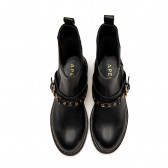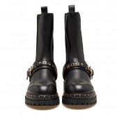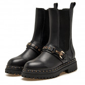 Questo anfibio nero in pelle nera combina un design grintoso e audace. La tomaia presenta un pannello elastico e un cinturino con fibbia dorata e borchie, che aggiungono un tocco di luce. La suola carrarmato con borchie dorate completa il look, rendendolo perfetto per un outfit casual e di carattere.